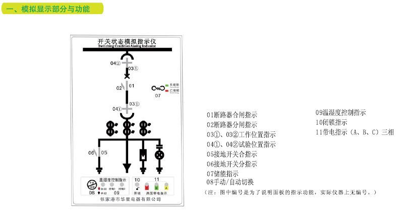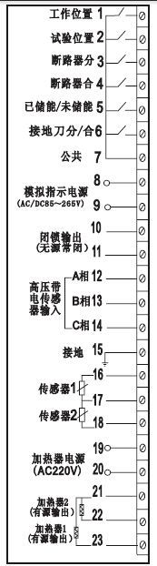 无源触点输入,工作位置触点闭合时,红色03①、03②垂直模拟条发光,显示断路器位于工作位置。