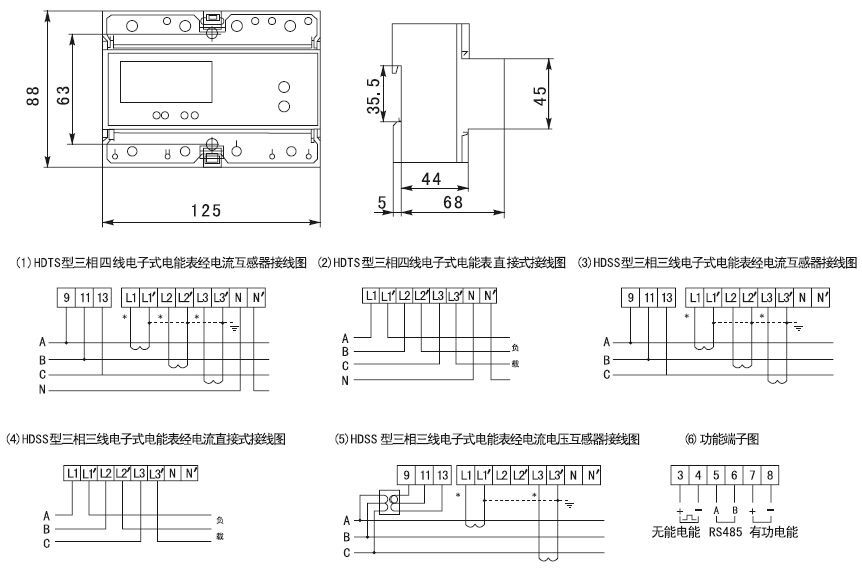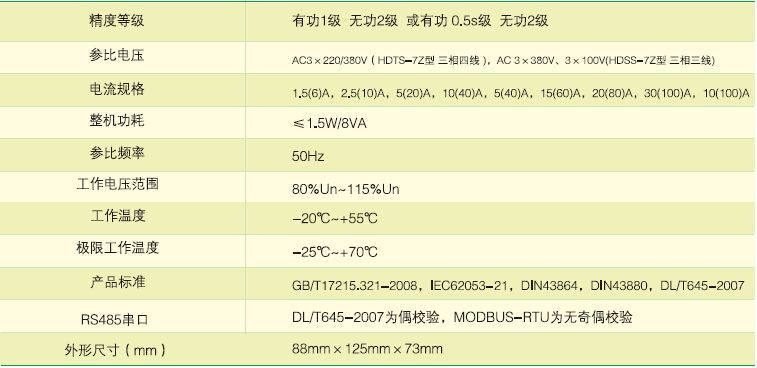 该电能表采用先进的单片机处理系统设计而成,具有电路简单、可靠性高、精度高等优点。该产品软件、硬件、结构设计技术先进,计量精度高,结合单片机资源,实现有功无功电能分时计量,三相实时电流、电压、有功功率、无功功率、功率因素等30多个电参数测里,具有RS-485通信功能, 抗干扰、防攻击性能好,工作温度范围宽,能长期稳定可靠工作。该产品各项误差性能指标符合国家GB/T 17215.321-2008《1级和2级静止式交流有功电能表》、DL/T645 - 2007《多功能电能表通信规约》等标准的技术要求(可定制MODBUS通讯协议)。