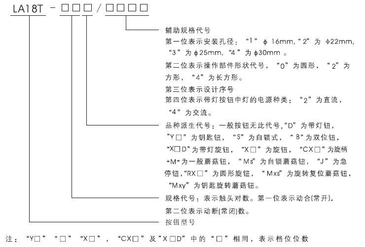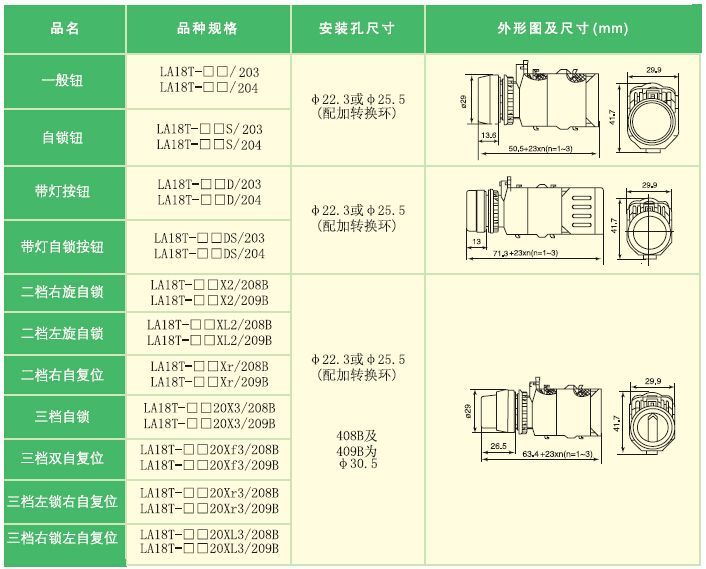 LA18T系列按钮适用于交流50赫兹(或60赫兹),电压380伏及以下,直流电压220伏及以下的磁力起动器、接触器、继电器及其它电气线路中作遥远控制之用;其中带灯式按钮(LED发光)还适用于需要灯光信号指示的场合。
